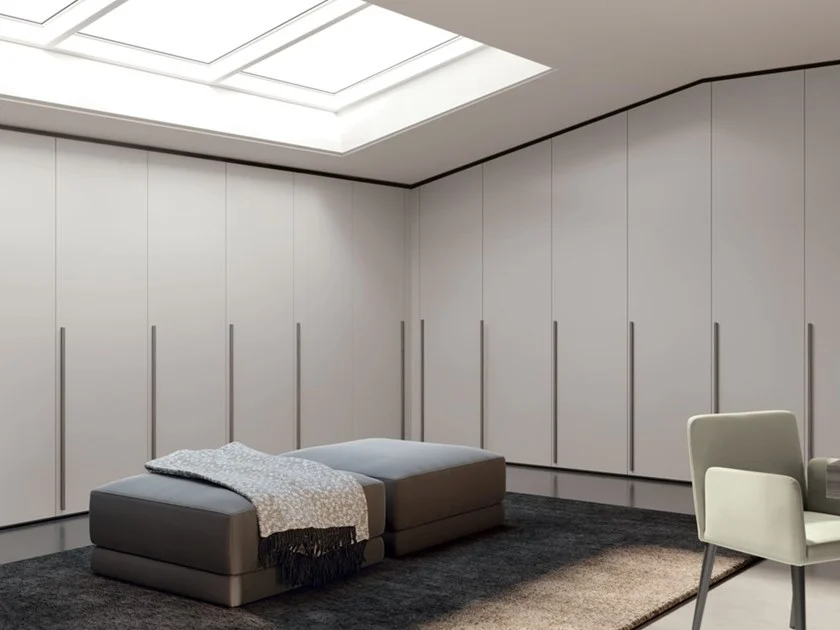 Porte battante Barret en mélaminé Grigio dorian et poignées avec contraste de couleur en mélaminé Eucalyptus argenté expriment les possibilités de composition des produits Febal Casa. Le dressing s’inscrit dans un espace partant directement du plafond avec une inclinaison variable en utilisant des portes biseautées dans leur hauteur et avec une coupe mansardée. Équipement intérieur avec barres de penderie Plus en métal Carbon grey et porte Barret avec coupe mansardée.