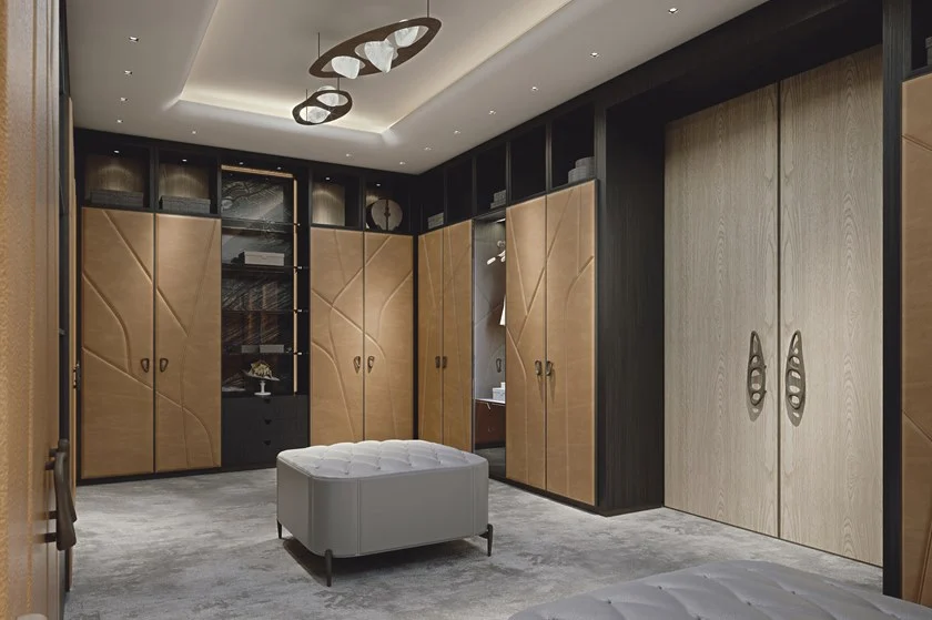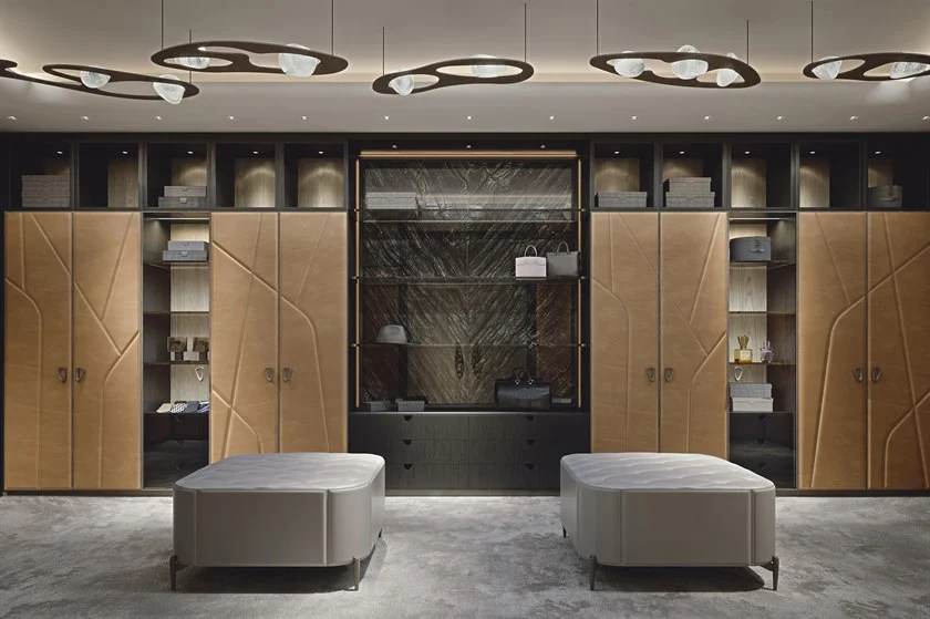 La collection Gea comprend un dressing sur mesure Afrodite, des portes recouvertes de cuir avec un matelassage géométrique, des éléments sans portes ou avec des tiroirs en frêne teinté gris, des poignées sculpturales et des détails en laiton finition nickel foncé.
