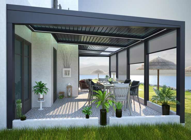 Le bioclimatique est connu sous le nom de systèmes de toits coulissants pliants. Dans le système de plafond pliant Bioclimatic, les panneaux de 36 cm de large utilisés comme matériau de revêtement de plafond tournent autour de leur propre axe et effectuent le mouvement de pliage.