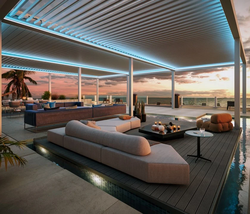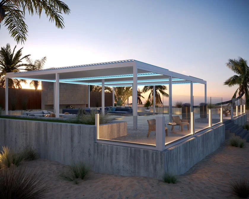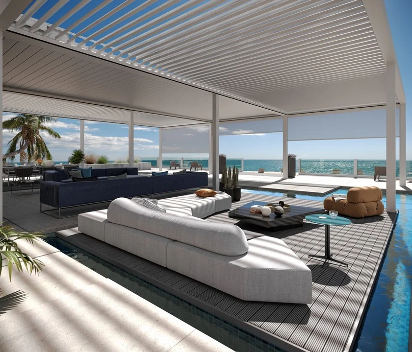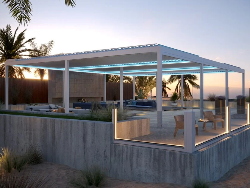 Axis Max est une pergola en aluminium avec des lumières intégrées, un système bioclimatique rotatif qui est conçu pour améliorer les extérieurs afin d’en faire des espaces de vie architecturaux personnalisés avec des lignes modernes. Système extensible jusqu’à 12 mètres de projection et 13,5 mètres de dimensions en largeur, une option praticable en particulier pour les applications longitudinales et les couvertures de grandes surfaces commerciales. Axis Max offre une protection et une utilisation optimale des espaces de vie extérieurs en permettant d’ajuster instantanément la lumière du soleil, créant une ventilation rafraîchissante en cas de températures élevées ou à l’abri des météo avec son mouvement de rotation de lamelle.