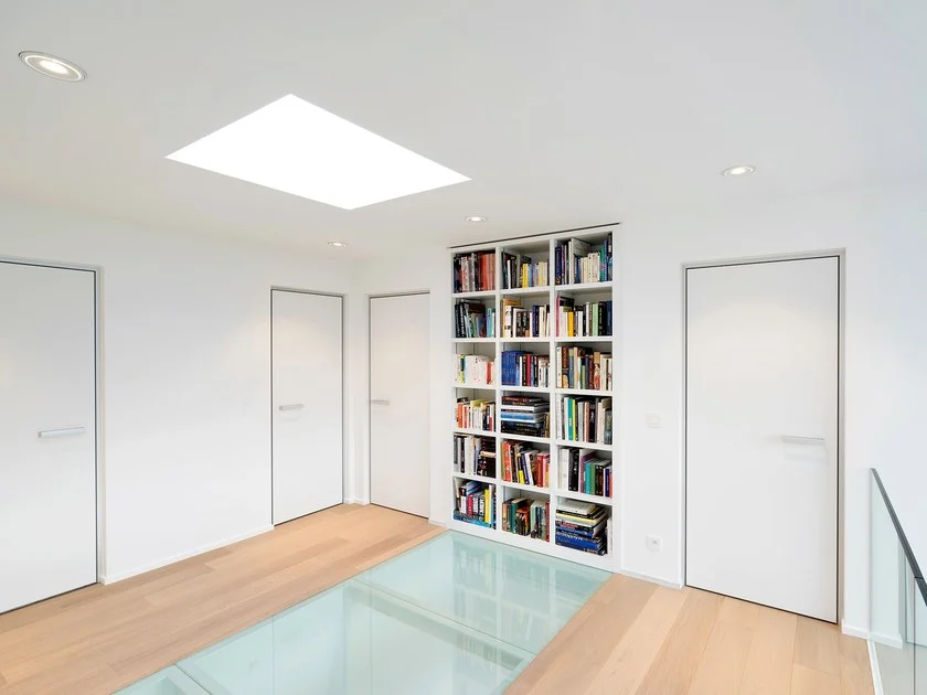 Le vantail de la porte est monté dans le profilé BKO de la porte à l’aide de charnières pivotantes à fermeture automatique dissimulées, fixées au cadre BKO. La position de la charnière reste interchangeable entre le côté gauche et le côté droit du cadre de la porte. Le profil BKO de 25 mm visuellement reste visible autour du vantail de la porte. Les transitions de sol ou les joints de pose doivent être au centre de l’embrasure de la porte. Les plinthes à l’intérieur de l’ouverture de la porte sont ensuite retouchées.