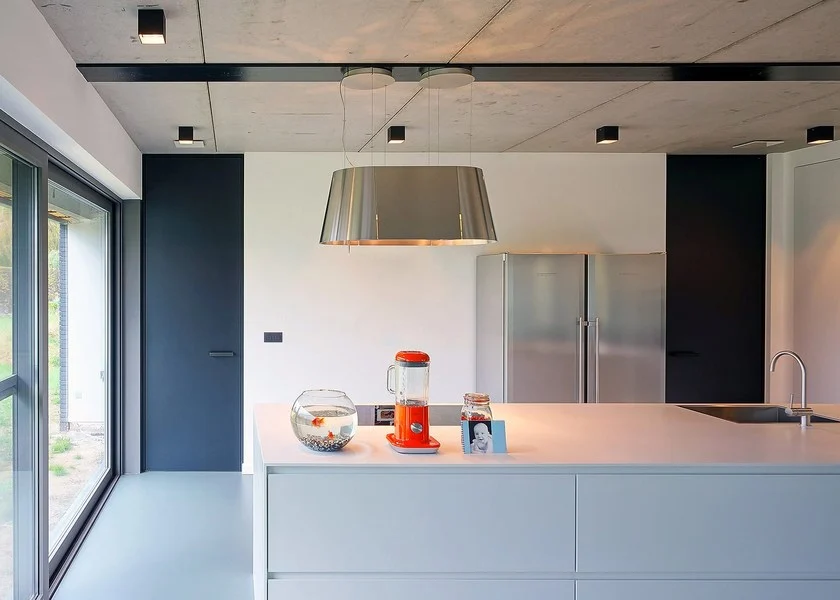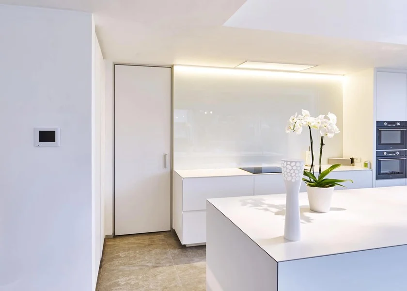 Le cadre BKO est vissé directement sur les chambranles finis à l’aide de cales anti-vibrations en caoutchouc. Le joint à peindre de 2,5 mm entre le profil en aluminium anodisé et la finition du mur est égalisé en douceur.