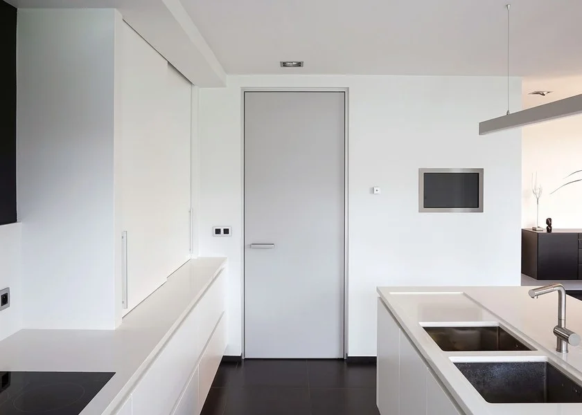 ANYWAYles portes sont toujours placées au centre de l’épaisseur du mur. Cette position centrale assure une vue identique des deux côtés de la porte. Un décentrage est possible, mais jamais au ras de la surface du mur. La ligne extérieure du vantail reste à au moins 25 mm du bord à des fins de montage et de stabilité.